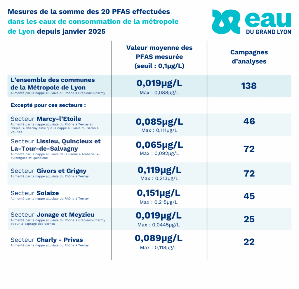 Sur l’année 2025, 423 campagnes d’analyses ont été réalisées sur l’ensemble de la métropole de Lyon. Ils concernent la somme des 20 perfluorés ciblés “préoccupants”, réglementée par le code de la santé publique, et dont le seuil réglementaire est fixé à 0,1 microgramme par litre (µg/L).
