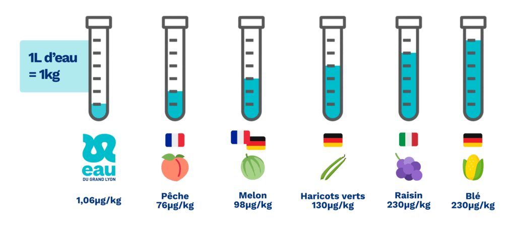 Quantité de TFA mesurée dans 1 litre d’eau, en comparaison avec 1 kg d’aliments végétaux