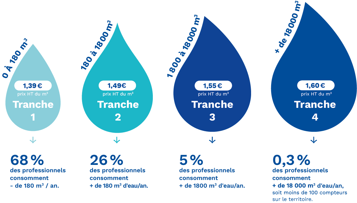 - La tranche 1 des professionnels correspond à la tranche 2 (tarif standard) des particuliers. Elle permet ainsi de préserver les entreprises qui consomment peu d’eau, parmi lesquelles les artisans ou commerçants notamment.